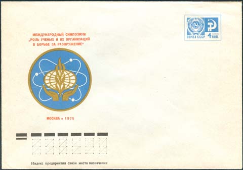 1975 г. Эмблема симпозиума. Текст: "Международный симпозиум "Роль ученых и их организаций в борьбе за разоружение" Москва 1975".