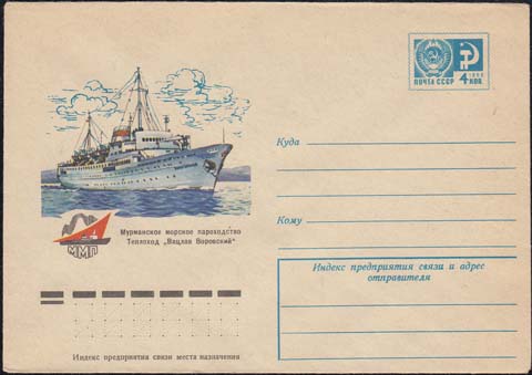 1976 г. Теплоход в море и эмблема Мурманского морского пароходства. Текст: "Мурманское морское пароходство. Теплоход "Вацлав Воровский"".