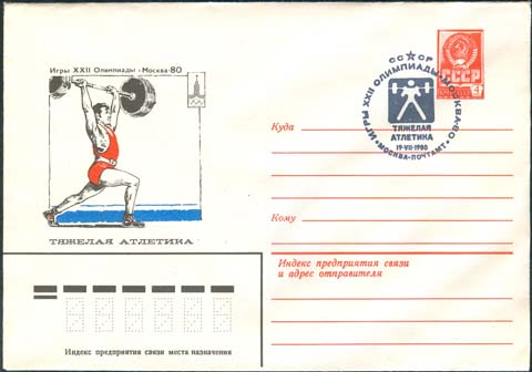 1979 г. Спортсмен-штангист. Текст: "Игры XXII Олимпиады. Москва-80. Тяжелая атлетика".