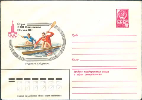 1979 г. Двое гребцов нв байдарках. Текст: "Игры XXII Олимпиады Москва-80. Гребля на байдарках".