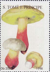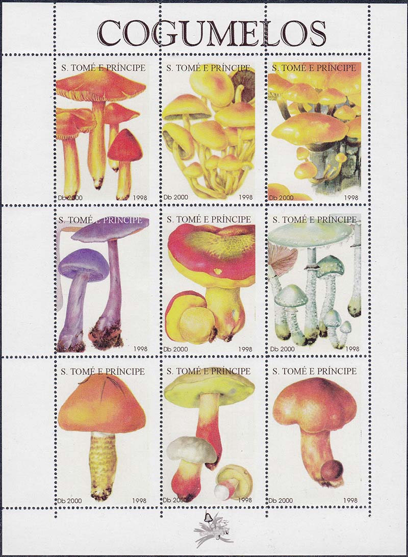1998 г. 02.07.1998 г. Разм. по перфорации 34 х 50 мм. Многоцветная печать на белой бумаге. Зубц. 13 3/4 х 14. С клеем. В центре различные грибы. Сверху название страны. Внизу номинал и год выпуска.