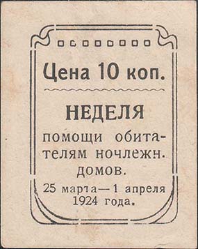 1924 г. 25.03. – 01.04.1924 г. Разм. 36 х 45 мм. Одноцветная печать на белой бумаге. В прямоугольной декоративной рамке сверху геометрический орнамент и номинал. В центре текст в четыре строки: «Неделя помощи обитателям ночлежн[ых]. домов». Внизу в две строки дата: «25 марта – 1 апреля 1924 года».