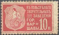 1910(?) г. Разм. рамки 31 х 17,5 мм. Одноцветная печать на белой бумаге. Зубц. 11 1/2. В прямоугольной рамке на цветном фоне слева герб Варшавы, справа текст в шесть строк: «В пользу благотворительных заведений гор. Варшавы» и номинал.