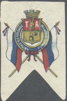 1912(?) г. Виньетка в виде вертикального флажка с вырезом в форме фестона в нижней части разм. 42 х 65 мм. Трехцветная печать на тонкой белой бумаге. В центре герб Варшавы на фоне двух скрещенных российских флагов. В двойной круглой рамке текст на русском и польском языках: «Помощь бедным».
