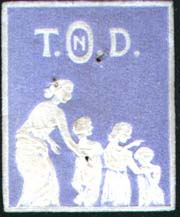 1912(?) г. Разм. рис. 27,5 х 24 мм. Одноцветная печать на белой бумаге с тиснением. В центре внизу женщина с тремя детьми. Сверху аббревиатура на польском языке «T.O.N.D.».