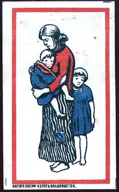 1920(?) г. Разм. рамки 33 х 60 мм. Трехцветная печать на белой бумаге. В центре в прямоугольной рамке женщина с двумя детьми. Внизу под рамкой справа выходные данные мелким шрифтом: «Литогр. Иосиф Курота. Владивосток».