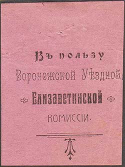 1915(?) г. Разм. 65 х 49 мм. Одноцветная печать на розовой бумаге. В центре текст в четыре строки: «В пользу Воронежской Уездной Елизаветинской комиссии». По бокам и внизу декоративные элементы.