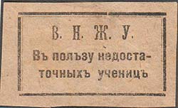 1915(?) г. Разм. 54 х 32 мм. Одноцветная печать на тонкой желтоватой бумаге. В двойной прямоугольной рамке разм. 45 х 25,5 мм текст в три строки: «В.Н.Ж.У. В пользу недостаточных учениц».