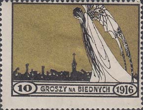 1916 г. Разм. рамки 43,5 х 32 мм. Двухцветная печать на белой бумаге. Зубц. 11 1/2. С клеем. В прямоугольной рамке аллегорический рисунок. Фигура женщины с крыльями и разрушенный город. Внизу номинал и текст на польском языке: «Бедным. 1916».