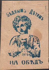 1915(?) г. Разм. 39 х 55 мм. Одноцветная печать на белой бумаге. В центре поясное изображение ребенка. Сверху полукругом текст: «Бедным детям». Внизу продолжение текста: «На обед».