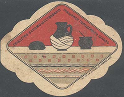 1917 г. 02.11.1917 г. Виньетка в виде ромба с волнистыми краями разм. 76 х 57 мм. Трехцветная печать на кремовой бумаге. В центре в двойной рамке в форме ромба с закругленными углами на столе кувшин, горшок и хлеб. Сверху по внутреннему периметру рамки текст: «Общество вспомошествования учащимся г…