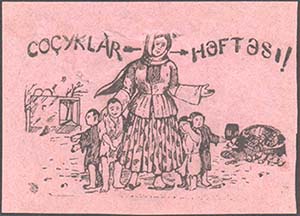 1925(?) г. Разм. 72 х 52 мм. Одноцветная печать на розовой бумаге. В центре женщина в национальной одежде с четырьмя детьми. Слева полуразрушенный дом. Справа развалившаяся печь. Сверху текст на азербайджанском языке (латинским шрифтом).