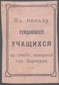 1915(?) г. Разм. рамки 31 х 45 мм. Одноцветная печать на серо-розовой бумаге. В двойной прямоугольной рамке с декоративными элементами по углам текст в пять строк: «В пользу нуждающихся уча-щихся ср[едне].-учебн[ых]. Заведений гор. Барнаула».