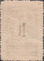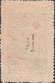 1932(?) г. Разм. рис. 22 х 33,5 мм. Двухсторонняя печать на желтоватой бумаге. Рисунок лицевой стороны аналогичен предыдущему выпуску. На оборотной стороне вертикально снизу вверх текст в две строки: «Тираж 3,000.000».