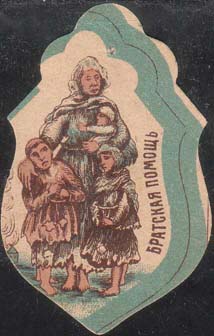 1916(?) г. Виньетка в виде фигурного щитка сложной формы разм. 36 х 55 мм. Трехцветная и многоцветная печать на белой бумаге. В центре группа беженцев на фоне горящей деревни. Справа текст: «Братская помощь». Слева сверху текст на азербайджанском языке арабским шрифтом.