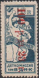 1923 г. Второй вспомогательный всероссийский выпуск. Красная надпечатка нового номинала в виде вертикального текста «100 р. дз. 23 г.» на марке первого выпуска номиналом 10 к.