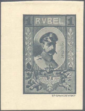 0 г. 1917 Разм. рамки 41 х 61 мм. Одноцветная печать на бумаге различных цветов. В центре в декоративной рамке портрет Ю. Пилсудского в военной форме. Справа от портрета вертикально снизу вверх текст на польском языке: «Ю. Пилсудский». Внизу одноглавый орел, скрещенные мечи и дубовые ветки. Сверху номинал. Внизу под рамкой выходные данные мелким шрифтом на польском языке: «Ст. Савичевский».