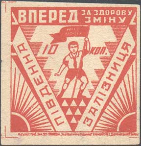 1932 г. Разм. рамки 43 х 43 мм. Одноцветная печать на желтоватой бумаге. В центре в прямоугольной рамке перевернутый треугольник из лент. В центре треугольника пионер с флагом, на полотнище которого текст в две строки на украинском языке: «Юный пионер». Сверху текст в две строки на украинском языке: «Вперед за здоровую смену». На лентах текст: «Южная железная дорога». В нижних углах два восходящих солнца с лучами. Внизу под рамкой неразборчиво выходные данные мелким шрифтом на украинском языке.