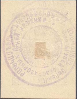 1925(?) г. Разм. 44 х 56 мм. Одноцветная печать на плотной кремовой бумаге. В центре в двойной прямоугольной рамке разм. 31 х 41 в декоративной рамке в центре в круге пятиконечная звезда. На лентах по периметру рамке текст на армянском языке: «Общество друзей беспризорных детей Армении». Сверху на картуше номинал. На обороте фиолетовый оттиск круглой печати общества.