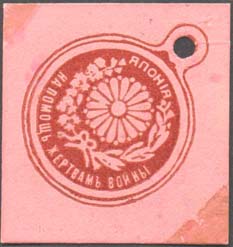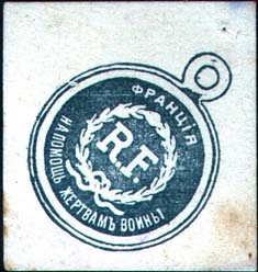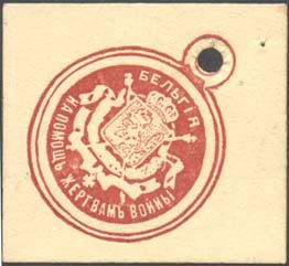 1915(?) г. Ромб разм. 39 х 39 мм. Одноцветная и двухцветная печать на белой бумаге. В центре медаль с гербами стран-союзниц России в Первой мировой войне. Сверху название страны. Внизу под гербом, кроме знаков с гербом России, полукругом текст: «На помощь жертвам войны».