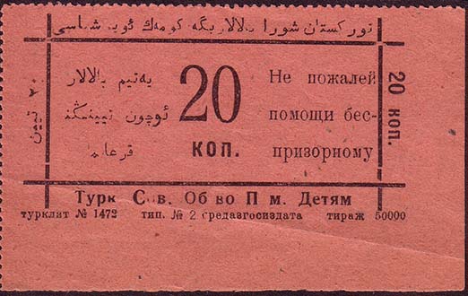 1924(?) г. Разм. рамки 64 х 27 мм. Одноцветная печать на бумаге различных цветов. В рамке номинал текст на русском и узбекском, арабским шрифтом языках: «...коп. Незаметные для каждого, об-легчают участь беспризорного». Внизу под рамкой текст: «Турк[естанское]. Сов[етское]. Об-во Пом[ощи]. Детям». Внизу мелким шрифтом выходные данные.