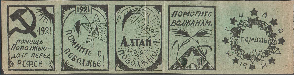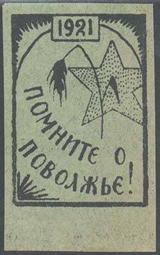 Разм. рамки  33 х 47 мм. В прямоугольной рамке сверху в левом углу серп и молот, в правом солнце. Ниже текст в пять строк: «1921. Помощь Поволжью – долг перед Р.С.Ф.С.Р.».