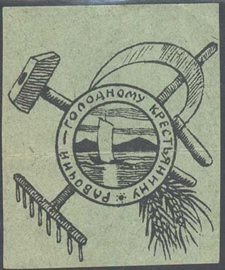 Разм.  52 х 62 мм. В центре на фоне серпа, молота, граблей и колосьев пшеницы в круглой рамке парусная лодка, плывущая по реке на фоне гор. По периметру рамки текст: «Рабочий – голодному крестьянину».
