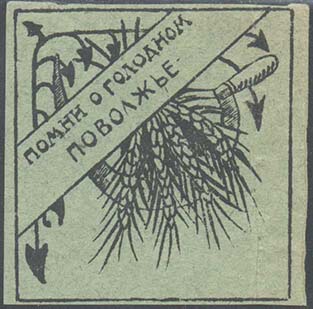 Разм. рамки  46 х 49 мм. В прямоугольной рамке в центре серп и колосья пшеницы. По диагонали текст в две строки: «Помни о голодном Поволжье».