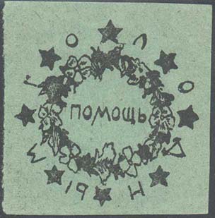 Разм.  50 х 50 мм. В центре в круглой декоративной рамке в виде венка цветов текст: «Помощь». По окружности рамки текст: «Голодным». Между буквами текста пятиконечные звезды.