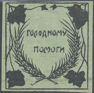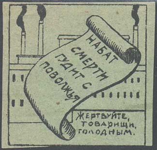 Разм. рамки  87 х 48 мм. В прямоугольной рамке на фоне завода картуш с текстом в четыре строки: «Набат смерти гудит с Поволжья». В правом нижнем углу текст в три строки: «Жертвуйте, товарищи, голодным».