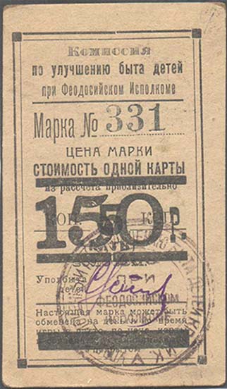 1924(?) г. Разм. 55 х 92 мм. Одноцветная печать толстой бумаге сероватой (оттенки) бумаге. В центре в двойной прямоугольной рамке разм. 45 х 80 мм текст в девять строк: «Марка №... (номер нумератором) Цена марки стоимость одной карты из расчета приблизительно коп. 5 коп. (Пять) золотом. Уполбыта детей ... (Подпись)». Сверху над чертой текст в три строки: «Комиссия по улучшению быта детей при Феодосийском Исполкоме». Внизу под чертой текст в пять строк: «Настоящая марка может быть обменяна на деньги во время игры в лотто по цене карты в совзнаках, устанавливаемой Уполбытом». На лицевой и оборотной сторонах синий оттиск круглой печати комиссии.
