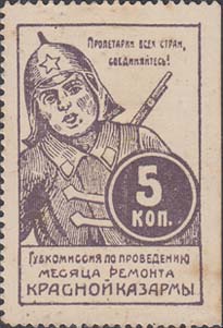 1923 г. Разм. рамки 29 х 44 мм. Одноцветная печать на белой бумаге. Зубц. 11 1/2. В прямоугольной рамке красноармеец с винтовкой за плечами. Справа в двойной круглой рамке номинал. В правом верхнем углу текст в две строки: «Пролетарии всех стран, соединяйтесь!». Внизу текст в три строки: «Губкомиссия по проведению месяца ремонта Красной Казармы».