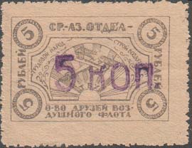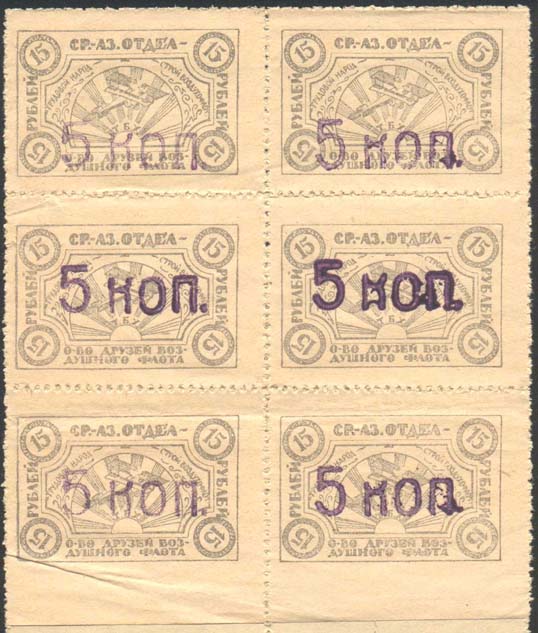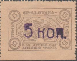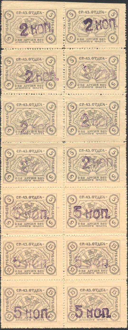 Примечание: Примечание(я): 1. Надпечатки всех номиналов наносились на лист попарно. 2. Из анализа фрагмента листа с надпечатками номиналов 2 к. и 5 к. можно сделать вывод, о том, что из надпечаток этих номиналов наименьший тираж имела марка с надпечаткой 5 к. на 5 р.