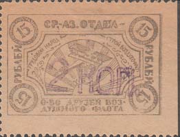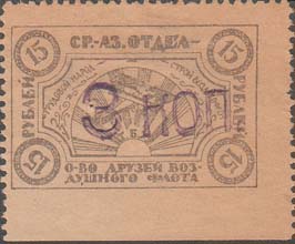 1924 г. Второй вспомогательный республиканский выпуск. Фиолетовая надпечатка нового номинала ручным штампом на марках предыдущего выпуска. Шрифт надпечатки крупный.