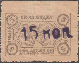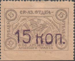 1924 г.  Второй вспомогательный республиканский выпуск. Фиолетовая надпечатка нового номинала ручным штампом на марках предыдущего выпуска. Шрифт надпечатки крупный.