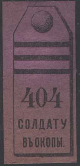 1915 г. 18.12.1915 г. Разм. 25 х 56 мм. Одноцветная печать на тонкой сине-серой бумаге. Погон с тремя поперечными лычками. Внизу цифры и текст в две строки: «Солдату в окопы».