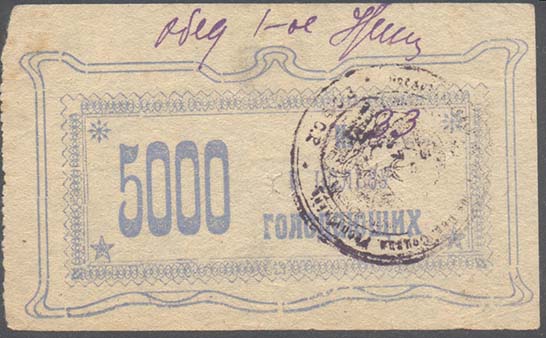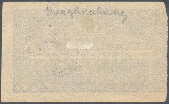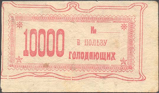 1922 г. 1922 г. Листок из квитанционной книжки разм. 84 х 44 мм. Одноцветная двухсторонняя печать на желтоватой бумаге. Нерегулярная левосторонняя зубц. На лицевой стороне в фигурном обрамлении прямоугольная узорчатая рамка. В прямоугольной узорчатой рамке слева номинал. Справа текст в две строки: «В пользу голодающих». На оборотной стороне на фоне из геометрического орнамента текст в две строки: «Г.С.С.Р. Центр[альная]. Комис[сия]. Помощ[и] голод[ающим]. Поволжья».