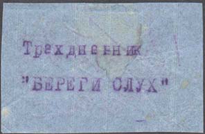 1927(?) г. Разм. 60 х 30 мм. Одноцветная печать на бумаге различных цветов. В центре машинописный текст в две строки: «Трехдневник «Берегите слух»».