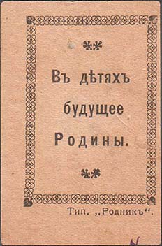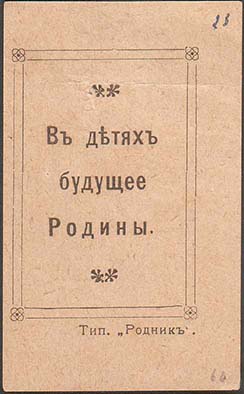 1916 г. Разм. Разм. 41 х 64 мм. Одноцветная печать на бумаге различных цветов. В прямоугольной рамке разм. 31 х 45 мм различных типов текст в три строки: «В детях будущее Родины». Сверху и снизу растительные декоративные элементы. Внизу под рамкой выходные данные мелким шрифтом: «Тип. «Родник»».