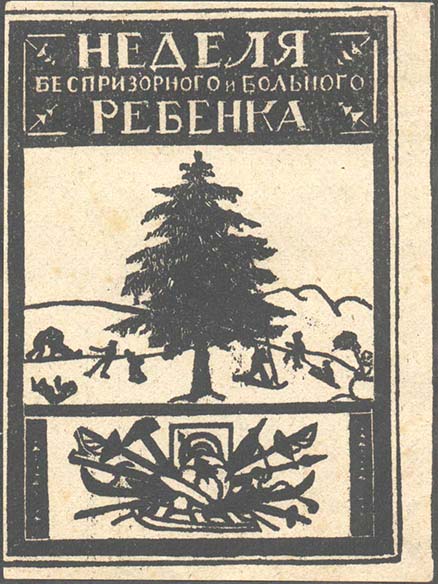 1925(?) г. Листок разм. 73 х 99 мм. Одноцветная печать на бумаге различных цветов. В центре в прямоугольной рамке разм. 66 х 94 мм елка, горки и играющие дети. Сверху текст в три строки: «Неделя беспризорного и больного ребенка». Внизу разнообразный спортивный инвентарь.