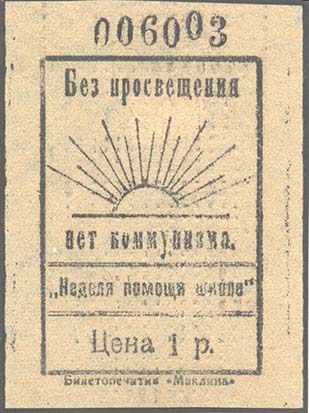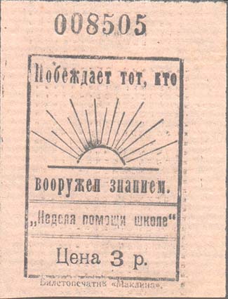 1923 г. Разм. 50 х 68 мм. Одноцветная печать на бумаге различных цветов. В центре в прямо-угольной рамке разм. 37 х 54 мм сверху восходящее солнце с лучами. Ниже между двумя горизонтальными чертами текст: «Неделя помощи школе». Сверху и в центре различные тексты. Сверху номер, проставленный нумератором. Внизу номинал. Внизу под рамкой мелким шрифтом выходные данные: «Билетопечатня Маклина».