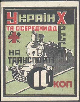 1931 г. Трехцветная двухсторонняя печать на белой бумаге. На лицевой стороне различные рисунки и текст на украинском языке: «Украинский красный крест и ячейки Д.Д. на транспорте». На оборотной стороне в центре в двойной рамке текст в три строки на украинском языке: «Принудительное распространение запрещено». Внизу выходные данные. Справа мелким шрифтом выходные данные: «Лит. «Красный путь» Харьков».