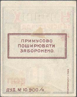 | На лицевой стороне в рамке разм. 42 х 44 мм красный креста, серп, якорь, топор и молоток, повторяющиеся по два раза в прямоугольных рамках. Внизу номинал. Выходные данные: «ЗАК. № 10.900/IV». | |||||