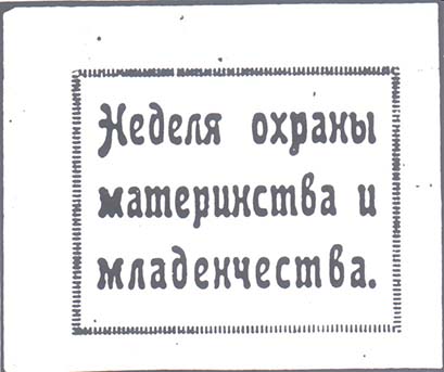 1925(?) г. Разм. рамки 53 х 42 мм. Одноцветная печать на тонкой желтоватой бумаге. В рамке текст в три строки: «Неделя охраны материнства и младенчества».