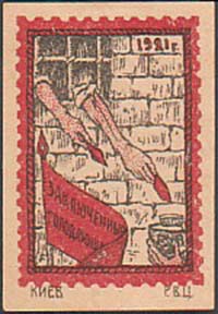 1921 г. Разм. рамки 30 х 44 мм. Двухцветная печать на желтоватой бумаге. В центре в прямоугольной рамке тюремное окно с решеткой, из которого две руки протягивают куски хлеба. В правом верхнем углу дата: «1921 г.». В левом нижнем углу знамя с древком. На полотнище знамени текст: «Заключенные голодающим». Справа внизу под рамкой мелким шрифтом выходные данные: «Киев, Р.Б.Ц.».