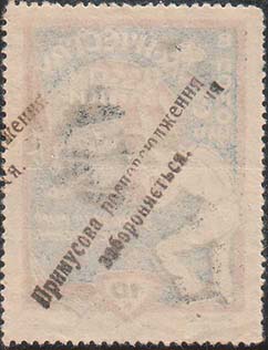 Ручная черная надпечатка текста на украинском языке в две строки по диагонали: «Принудительное распространение запрещается» на оборотной стороне марки предыдущего выпуска.