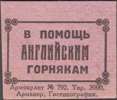 1926 г. Разм. 40 х 34 мм. Одноцветная печать на бумаге различных цветов. В прямоугольной рамке с декоративными элементами по углам в центре текст в три строки: «В помощь английским горнякам».