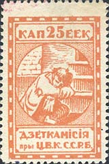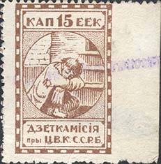1924 г. Первый республиканский выпуск. Разм. рамки 23 х 36,5 мм. Одноцветная печать на белой (оттенки) бумаге. Зубц. 11 1/2. С клеем. В центре беспризорный ребенок, сидящий на ступенях. Сверху номинал, внизу текст в две строки на белорусском языке: «Деткомиссия при Ц.И.К. С.С.Р.Б.».