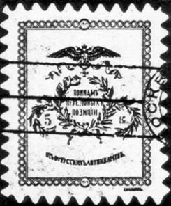 1914 г.   Разм. 32 х 39 мм. Одноцветная печать на белой бумаге. Зубц. 11 1/2 и Б.З. Сверху орел с георгиевским крестом, ниже венок, в центре которого текст в три строки: «Воинам передовых позиций». Ниже полукругом текст: «От Общества Русских Антиквариев». Номинал в боковых гирляндах венка. Тип I – высота цифр номинала 2,5 мм. Тип II – высота цифр номинала 2 мм.