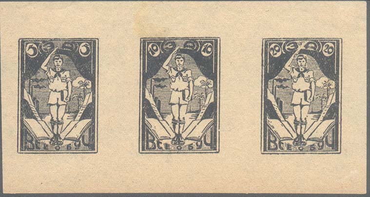 1932 г.   Разм. 39 х 67 мм. Одноцветная печать на бумаге различных оттенков. В центре в прямоугольной рамке пионер, отдающий салют, на фоне завода и пальм. Внизу открытые книги. В верхних углах номинал. Сверху текст: «За». Внизу продолжение текста: «Всеобуч».